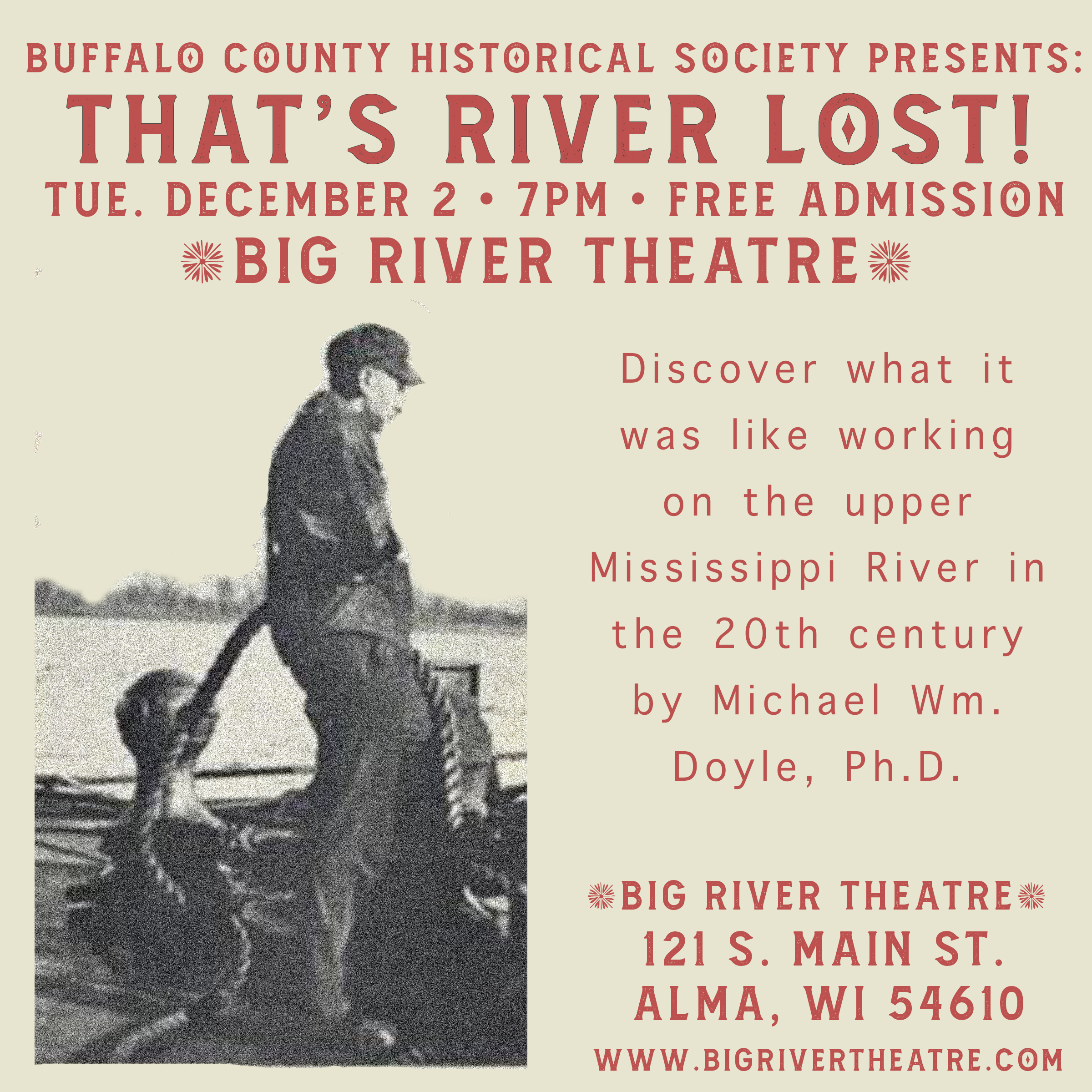 The Buffalo County Historical Society presents “That’s River Lost!” Soundings of the Upper Mississippi. Join us on Tuesday, December 2nd, to celebrate the beginning of the Society’s 45th year. Michael Wm. Doyle, Ph.D., the Society’s first Director, will discuss this important oral history project he helped create in 1981. This will be a fun and informative audio-visual presentation! Hear from the people who worked on the River, many from Alma and Fountain City!