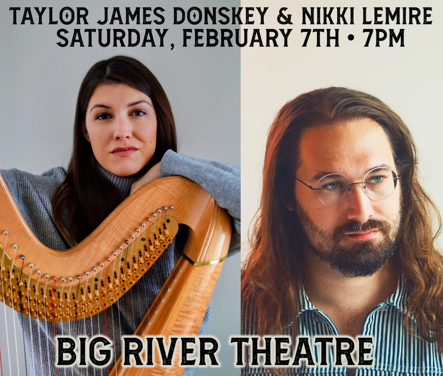 A special performance is coming up Saturday, February 7th at 7pm – it’s Taylor James Donskey (guitar, vocals) and Nikki Lemire (harp, vocals).